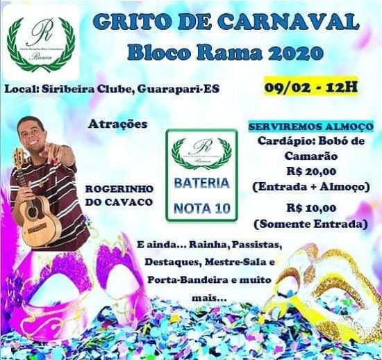 Com o objetivo de angariar fundos, o tradicional bloco de rua de Guarapari, Rama, irá realizar no próximo domingo (09) um grito de carnaval com direito a almoço e show das passistas acompanhadas da bateria do bloco. “Será uma tarde festiva. A abertura do Carnaval que já está próximo”, contou Rogerinho do Cavaco, um dos compositores do bloco.