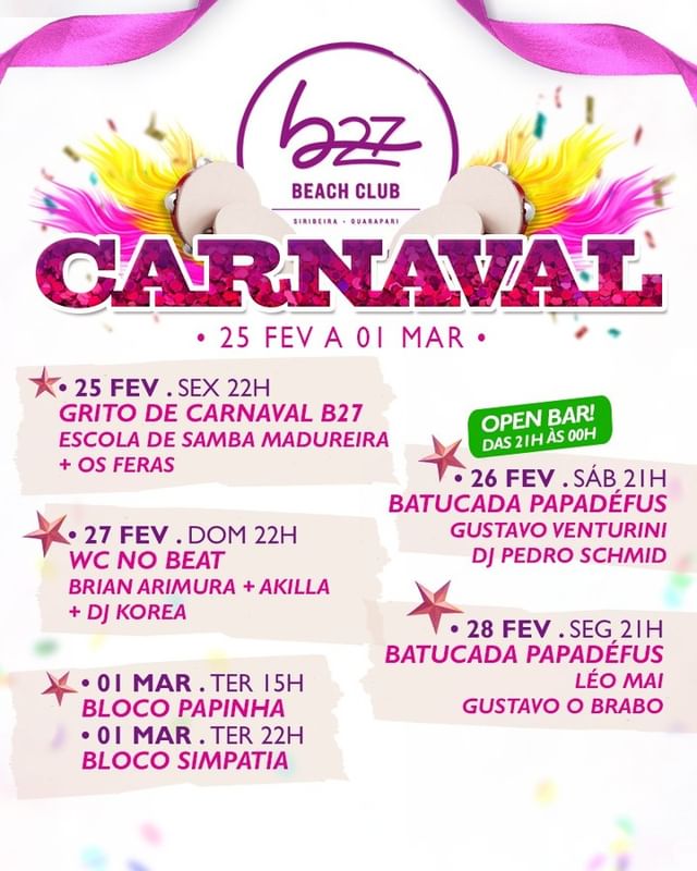 No B27 Beach Club, localizado no Siribeira, o sábado (26) já começa no ritmo de Carnaval, com um dos blocos mais tradicionais de Guarapari. o bloco Papadefus se apresenta às 21h, com Open Bar até às 00h. A noite também tem a participação do sertanejo capixaba Gustavo Venturini e do Dj Pedro Schmid.