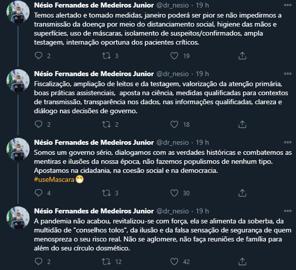 Em postagem em rede social, o Secretário Estadual de Saúde Nésio Fernandes alertou a população sobre a necessidade de reforçar os cuidados com a propagação do vírus. “Janeiro poderá ser pior se não impedirmos a transmissão da doença por meio do distanciamento social, higiene das mãos e superfícies, uso de máscaras, isolamento de suspeitos/confirmados, ampla testagem, internação oportuna dos pacientes críticos”, observou Nésio.