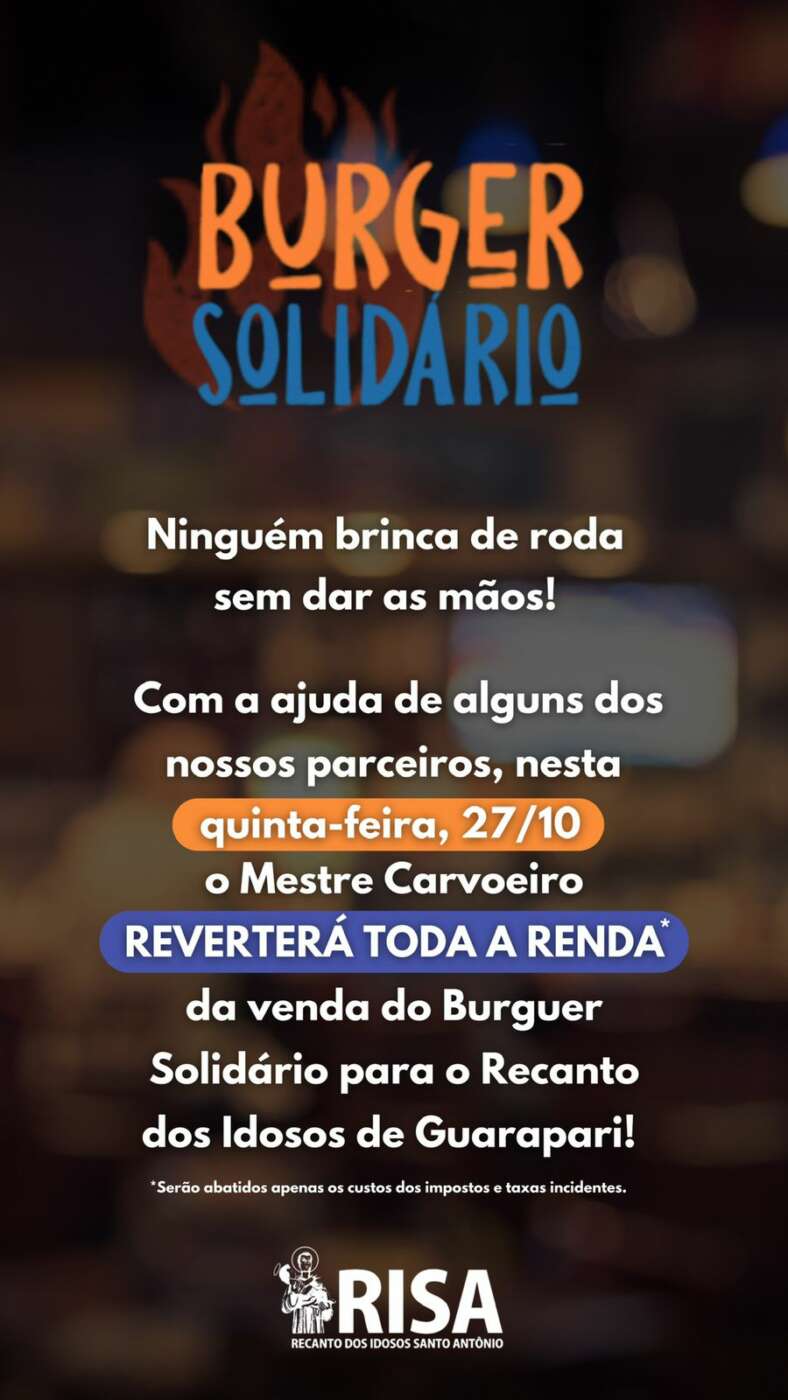 O Carvoeiro Brasa & Bar inicia nesta quinta-feira (27) o “Burger Solidário”. O bar e restaurante, que funciona no Centro de Guarapari, reverterá toda a venda do lote de hamburguer criado para a ação em prol do Recanto dos Idosos.
