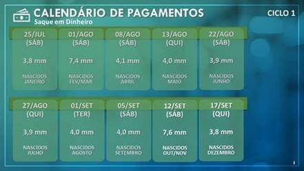 A partir deste sábado, 7,6 milhões de beneficiários nascidos em outubro e novembro poderão sacar o benefício nas máquinas de autoatendimento, nas unidades lotéricas e nos correspondentes CAIXA Aqui, além de transferir valores para contas da CAIXA ou de outros bancos, de acordo com o Ciclo 1 do calendário de pagamentos.