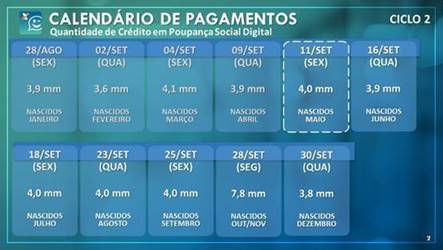 Nesta sexta (11), a CAIXA credita os valores correspondentes ao Ciclo 2 do Auxílio Emergencial na conta Poupança Social Digital de 4 milhões de beneficiários nascidos em maio e, na próxima quarta-feira (16), mais 3,9 milhões de pessoas com data de nascimento em junho receberão o crédito. O calendário de crédito em conta digital deste ciclo vai até o fim de setembro: