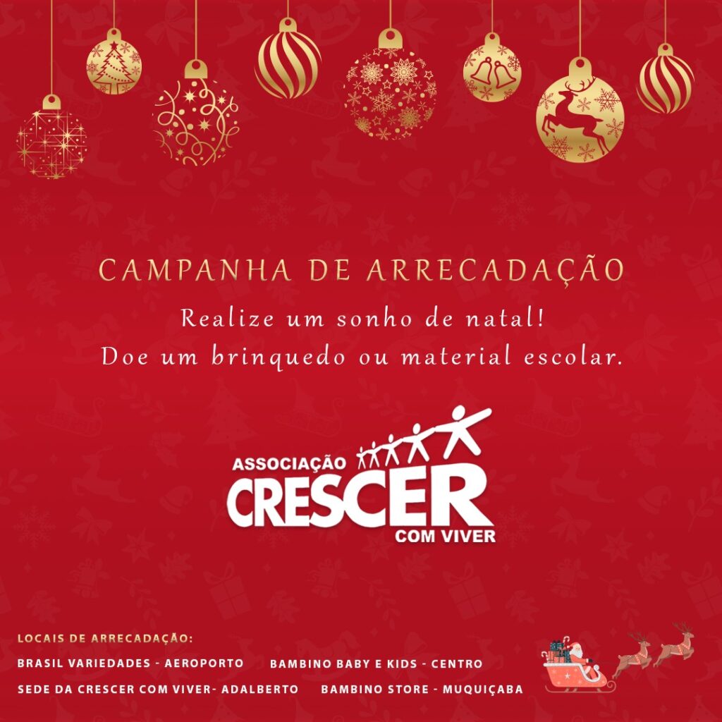 A campanha segue até a próxima quarta-feira (07) e as doações podem ser entregues em Guarapari, nas lojas: Bambino Baby e Kids, no Centro, Bambino Store, em Muquiçaba e Brasil Variedades, no Aeroporto. Ou na Sede da ONG, no bairro Adalberto Simão Nader. Além das doações em produtos, também podem ser realizadas doações de valores através do PIX da Crescer com Viver com a chave: 11301977000165 (CNPJ) – discriminando doação Natal 2022.