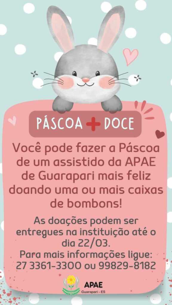 “Sua contribuição pode fazer a diferença e proporcionar momentos de alegria e doçura para quem recebe os cuidados da APAE. Participe e ajude a fazer a Páscoa de um dos assistidos pela APAE Guarapari muito mais doce!”, reforçou Edilene de Souza Francisco, coordenadora geral da APAE Guarapari.