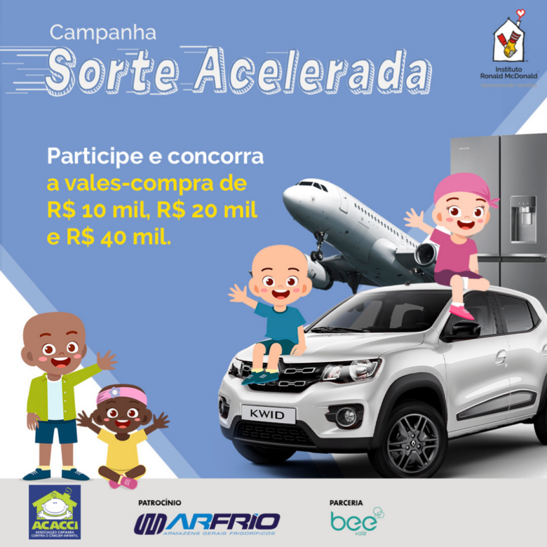 Em sua segunda edição, a campanha “Sorte Acelerada”, uma realização do Instituto Ronald McDonald em parceria com a Associação Capixaba Contra o Câncer Infantil (Acacci), promove a venda de cupons virtuais que serão sorteados nos dia 28 de agosto, 30 de outubro e 22 dezembro deste ano pela Loteria Federal. O valor arrecadado das vendas dos cupons será revertido para a instituição.