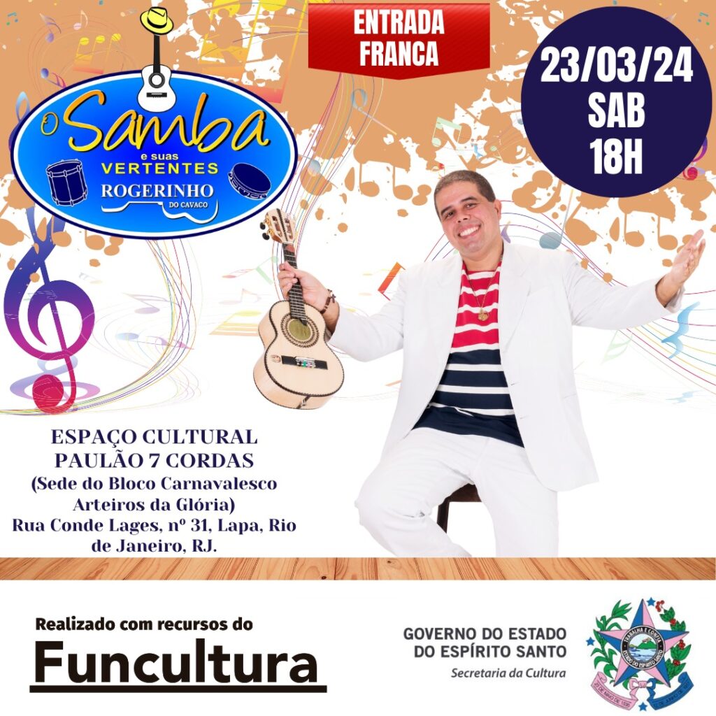 O cantor, compositor, músico e jornalista de Guarapari, Rogerinho do Cavaco vai se apresentar na Lapa, conhecido reduto da boemia e do samba do Rio de Janeiro. O show musical intitulado “O Samba e suas vertentes” tem apoio da Secretaria de Cultura do Estado do Espírito Santo – Secult, através do Fundo Nacional de Cultura.