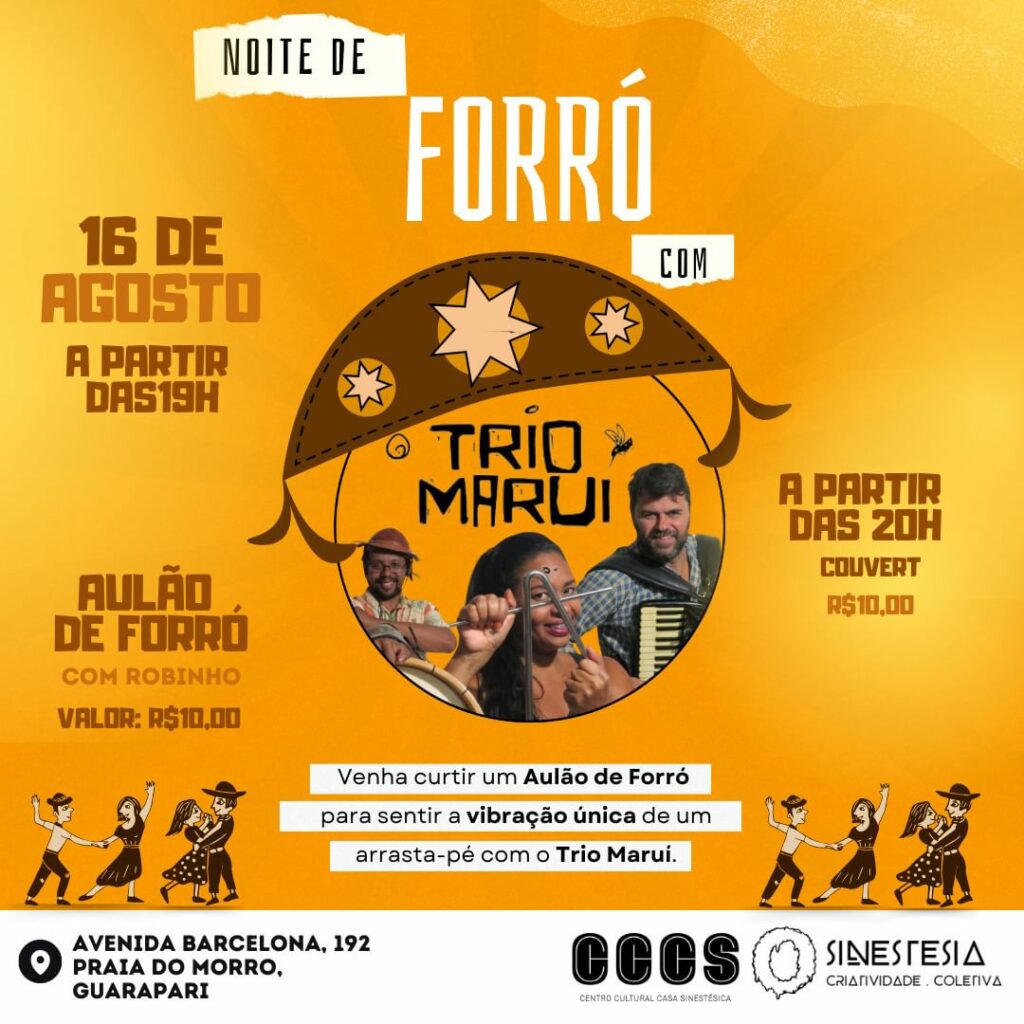 Nesta sexta-feira (16), o Centro Cultural Casa Sinestésica, na Praia do Morro, será palco de uma animada Noite de Forró. O evento, promovido pelo Sinestesia – Criatividade Coletiva em parceria com o Trio Maruí, promete movimentar o público com muita música e dança. A programação começa às 19h com um aulão de forró com o professor Robinho, seguido por um show ao vivo a partir das 20h.