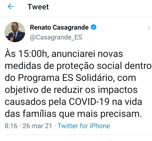 Após o anúncio, ontem (25), de medidas mais restritivas na tentativa de conter a contaminação do novo Coronavírus (Covid-19) no Espírito Santo, o governador do Estado, Renato Casagrande se pronunciará nesta tarde (26) para a divulgação de medidas de proteção social. De acordo com a publicação feita na manhã desta sexta-feira em uma rede social, Casagrande implantará as medidas com o objetivo de reduzir os impactos causados pelo vírus na vida das famílias capixabas mais necessitadas.