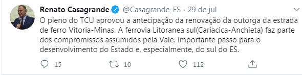 “É um passo importante para o desenvolvimento do Estado, especialmente do sul do Estado, que precisa de oxigênio para o seu desenvolvimento e que pode viabilizar a antecipação da Samarco de funcionar em um percentual maior. Se você tem capacidade de levar minério, sem ter a preocupação com o mineroduto, com as questões ambientais relacionadas, também isso pode ajudar na operação da Samarco e de outros investimentos”, frisou Casagrande, que também comentou sobre o assunto nas redes sociais.