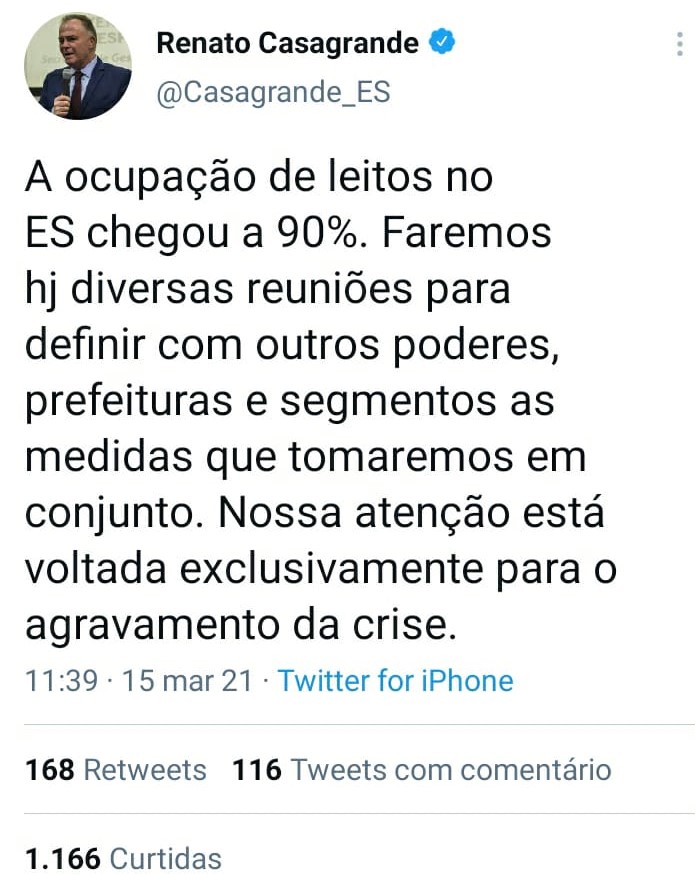 O Governador do Espírito Santo, Renato Casagrande anunciou no final desta manhã (15), em um rede social, que a ocupação dos leitos destinados a pacientes com o novo Coronavírus (Covid-19) no Estado chegou a 90% de ocupação. A taxa, segundo divulgado pelo secretário de Saúde Nésio Fernandes, foi definida como limite para a tomada de medidas mais extremas para conter o avanço da doença no Estado.