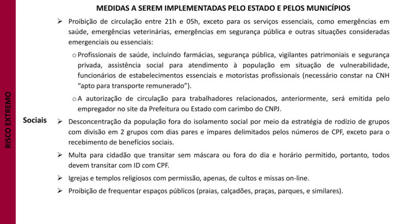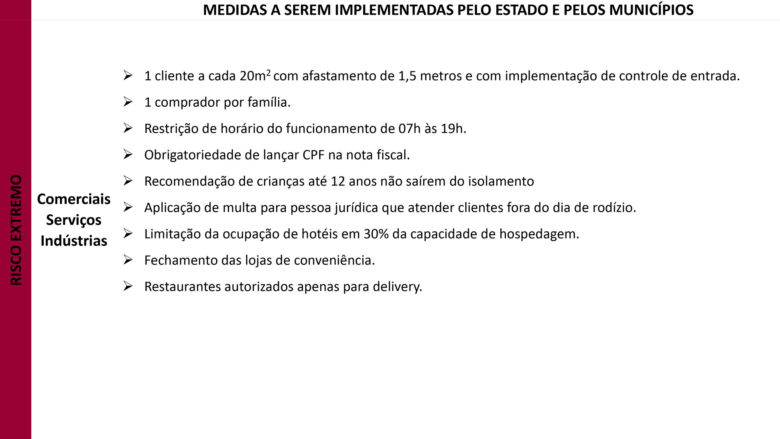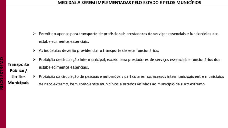 Estão previstas determinações para convívio social, funcionamento de estabelecimentos comerciais, transporte público e proteção das barreiras de limites de municípios em caso de Risco Extremo, visando a redução da interação social e a consequente diminuição do índice de transmissão da doença.