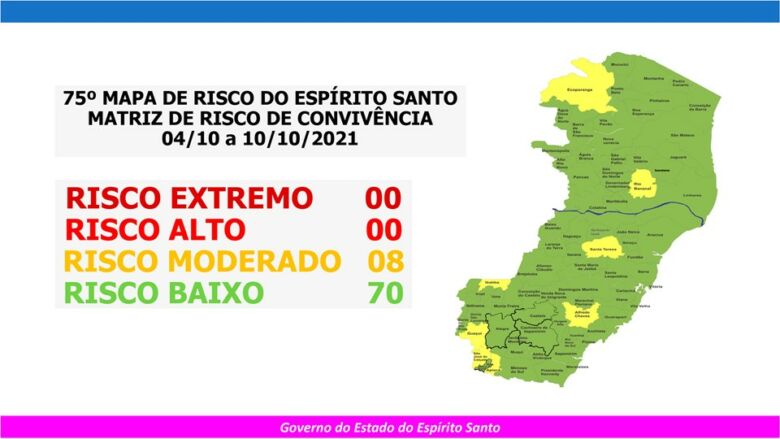 O Governo do Estado anunciou, nesta sexta-feira (1º), o 75º Mapa de Risco Covid-19, que terá vigência desta segunda-feira (04) até o próximo domingo (10). Dos 78 municípios capixabas, 70 estão classificados em Risco Baixo e oito, incluindo Alfredo Chaves, em Risco Moderado. Não há municípios em Risco Alto.