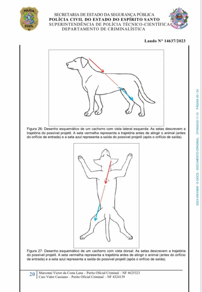 Durante a sessão, a CPI apresentou o laudo feito pela Polícia Técnico-Científica no corpo do animal. O laudo comprova que a morte foi provocada por um tiro de arma de fogo, disparado de cima para baixo.
