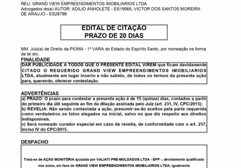 Edital de Citação – Processo nº 5001946-28.2023.8.08.0062 – VALIATI PRE-MOLDADOS LTDA – EPP x GRAND VIEW EMPREENDIMENTOS IMOBILIARIOS LTDA