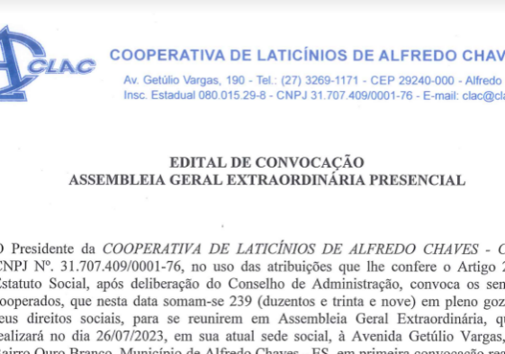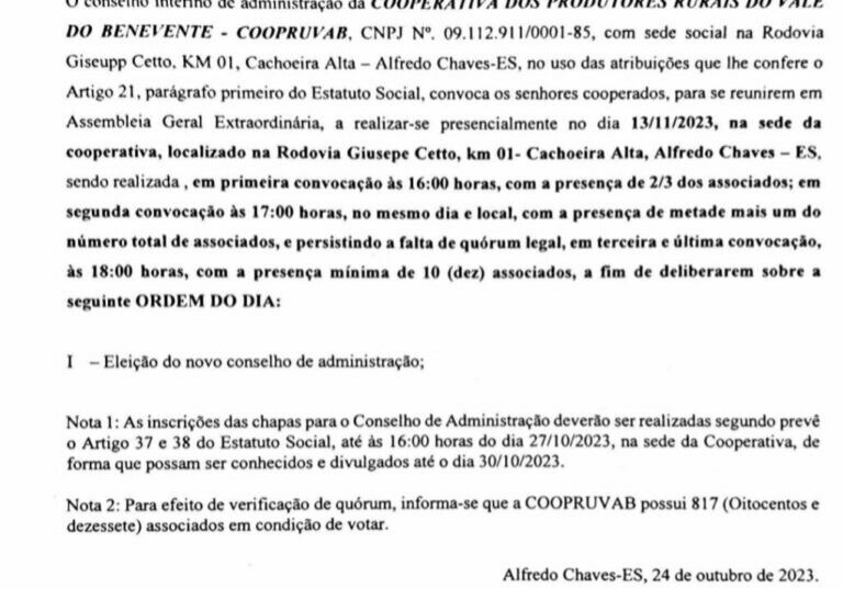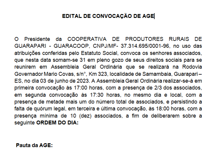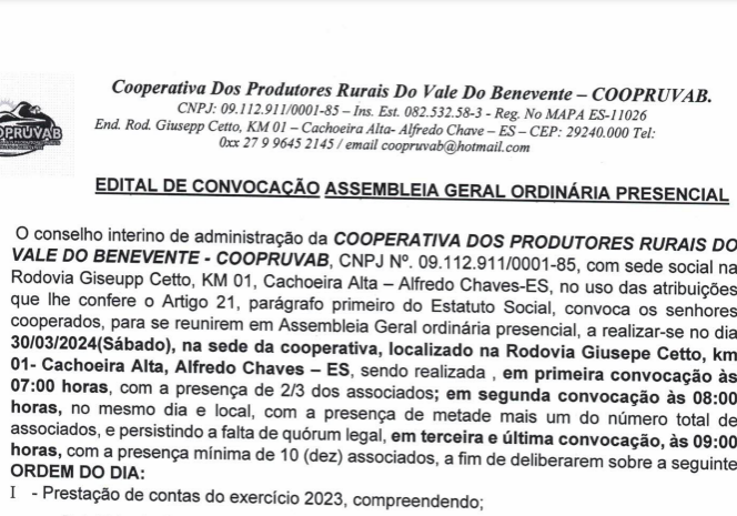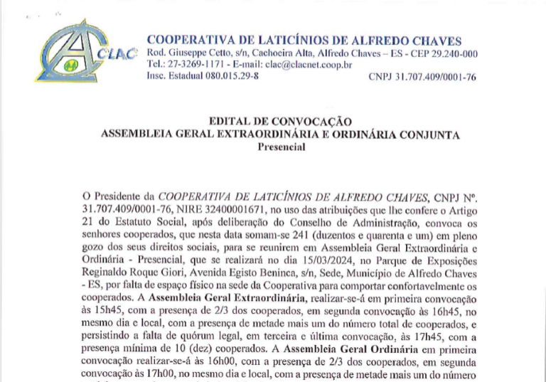 Edital de Convocação de Assembleia Geral Ordinária 25/05/2024