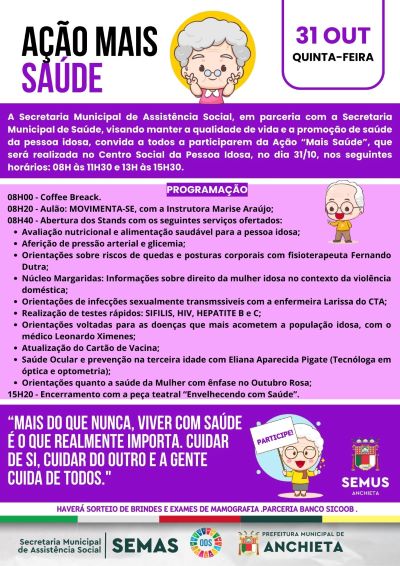 Nesta quinta-feira (31), das 08h às 15h30, o Centro Social do Idoso receberá a “Ação Mais Saúde”, um evento que vai oferecer uma série de serviços preventivos e de cuidados com a saúde.