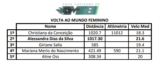 Após pedalar por seis dias, de 20 a 26 de julho, com quilometragens variadas e que, ao final resultaram em 1.020,7 quilômetros pedalados e monitorados por aplicativo, a ciclista de Guarapari Christiana da Conceição levou o primeiro lugar feminino nas categorias “Volta ao Mundo”, “Everest” e “K2”, da “Copa Capixaba de Mountain Bike Virtual”. Ela que pertence a equipe “Guarapari Race Team”, fez parte inicialmente da categoria K2, chegou também ao terceiro lugar geral.
