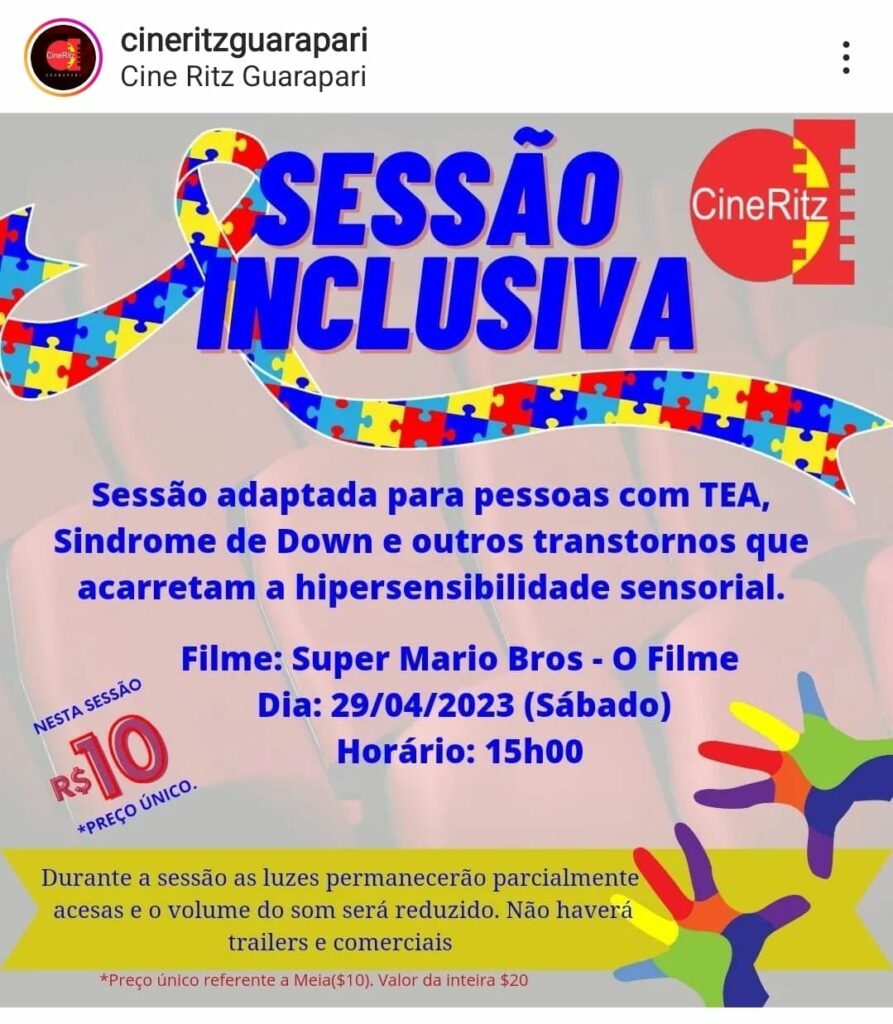Publicado nesta segunda-feira (24) na rede social do Cine Ritz Guarapari, a primeira sessão adaptada de cinema para pessoas com TEA – Transtorno do Espectro Autista, Síndrome de Down e outros transtornos que acarretam a hipersensibilidade sensorial.