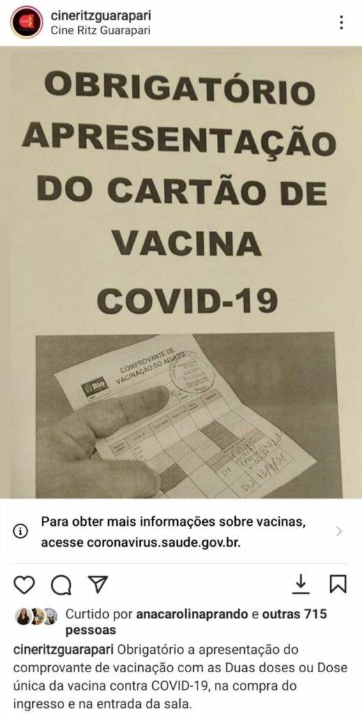 Em publicação feita em uma rede social nessa quinta-feira (23), o Cine Ritz Guarapari divulgou a obrigatoriedade da apresentação do comprovante de vacinação contra a Covid-19, o chamado de “passaporte da vacina”, para compra do ingresso e entrada nas sessões do cinema. O documento é válido mediante a comprovação com duas doses dos imunizantes Astrazeneca, Coronavac e Pfizer, ou dose única em caso da vacina da Janssen.