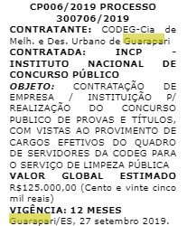 A Companhia de Melhoramento e Desenvolvimento Urbano de Guarapari (Codeg) prevê a realização de um concurso para os próximos 12 meses no município. Uma publicação feita no Diário Oficial mostra o resumo do contrato feito com o Instituto Nacional de Concurso Público (INCP), que será responsável pela realização do processo de seleção.
