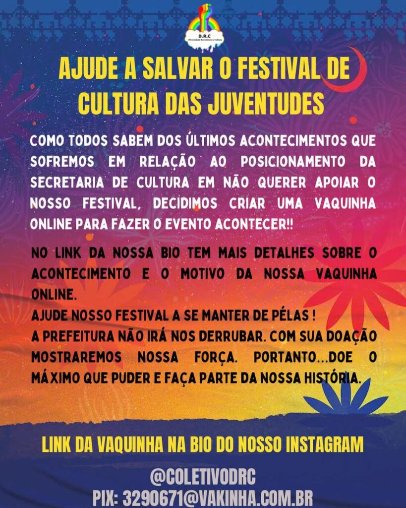 O Coletivo Diversidade, Resistência e Cultura (DRC) iniciou nesta quinta-feira (17) uma campanha para a realização do 1° Festival de Cultura das Juventudes de Guarapari. Os organizadores do evento, que está marcado para os próximos dias 25 e 26 de novembro em Olaria, não conseguiram apoio da Secretaria Municipal de Turismo, Empreendedorismo e Cultura (Setec) para a estrutura de som e iluminação.