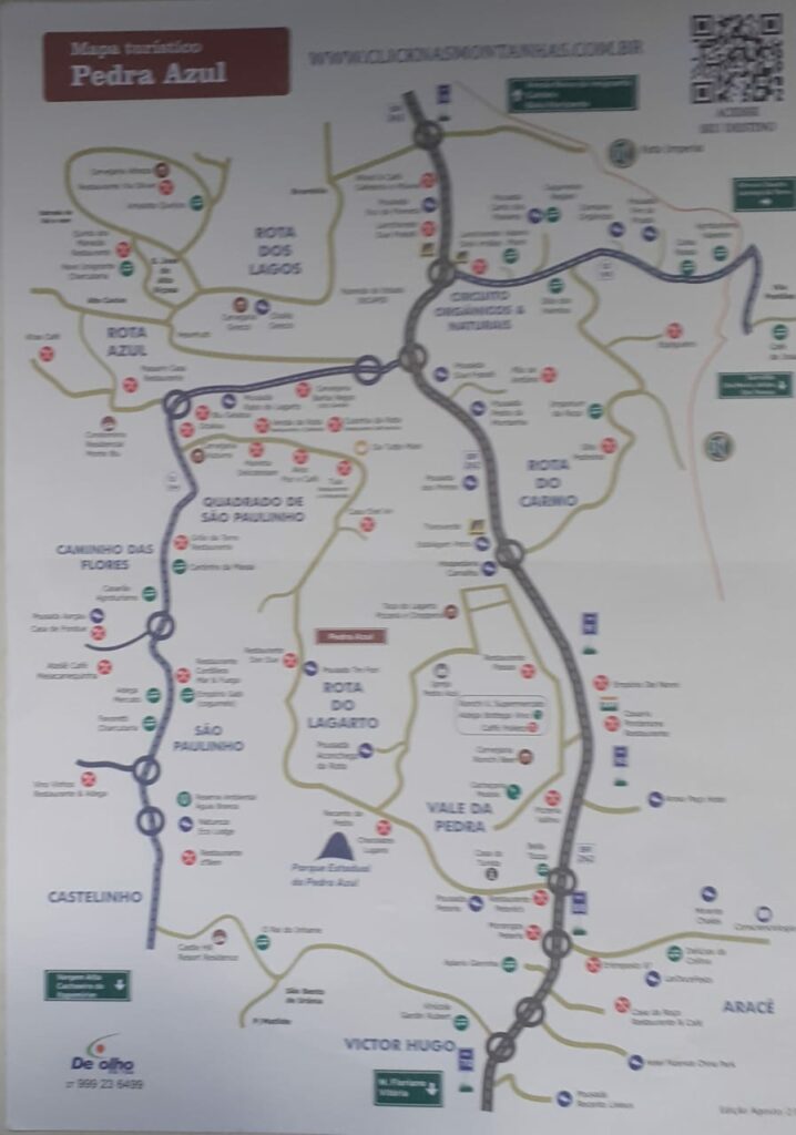 Chegando à Pedra Azul, um ícone do turismo capixaba, algumas rotas se apresentam: as Rotas do Lagarto, Rota Azul, Rota dos Lagos, Rota do Carmo, das Flores e o Circuito Orgânico.