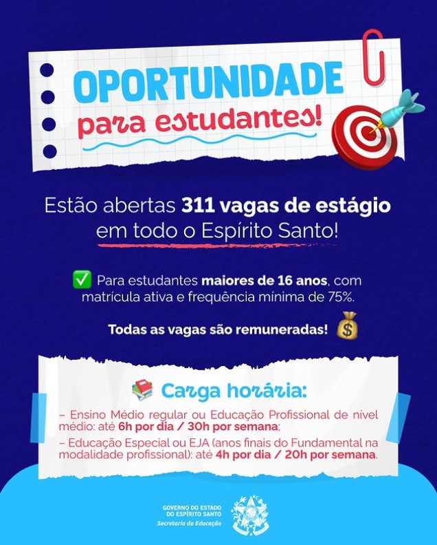 A iniciativa visa aproximar os estudantes de experiências práticas, contribuindo para o desenvolvimento de habilidades e o preparo para o mercado. Ao todo, são 311 vagas distribuídas em todo o Espírito Santo.