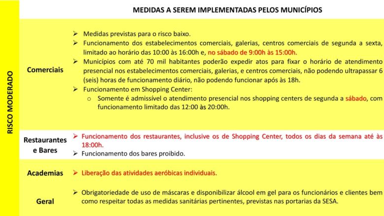 Poderá funcionar o comércio de segunda a sábado, sendo que no sábado, seja o funcionamento de 09h às 15h. Os municípios que têm menos de 70 mil habitantes podem funcionar 6 horas e podem escolher o horário de funcionamento, desde que não passe das 18h. Com mais, pode funcionar de 10h até 16h, de segunda a sexta-feira, e no sábado, de 09h às 15h. Sobre restaurantes, inclusive em shoppings, está autorizado o funcionamento todos os dias da semana, até 18h.