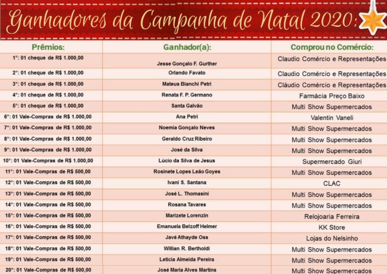 Confira os ganhadores da “Campanha de Natal” realizado no comércio de Alfredo Chaves