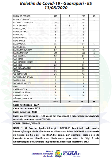 O boletim epidemiológico mais recente, divulgado hoje (13), pela Prefeitura de Guarapari, por meio da Secretaria Municipal da Saúde, atualiza o número de casos confirmados do novo coronavírus (Covid-19) no município para 2.362, 34 casos a mais que ontem (12). Não foram registrados novos óbitos.