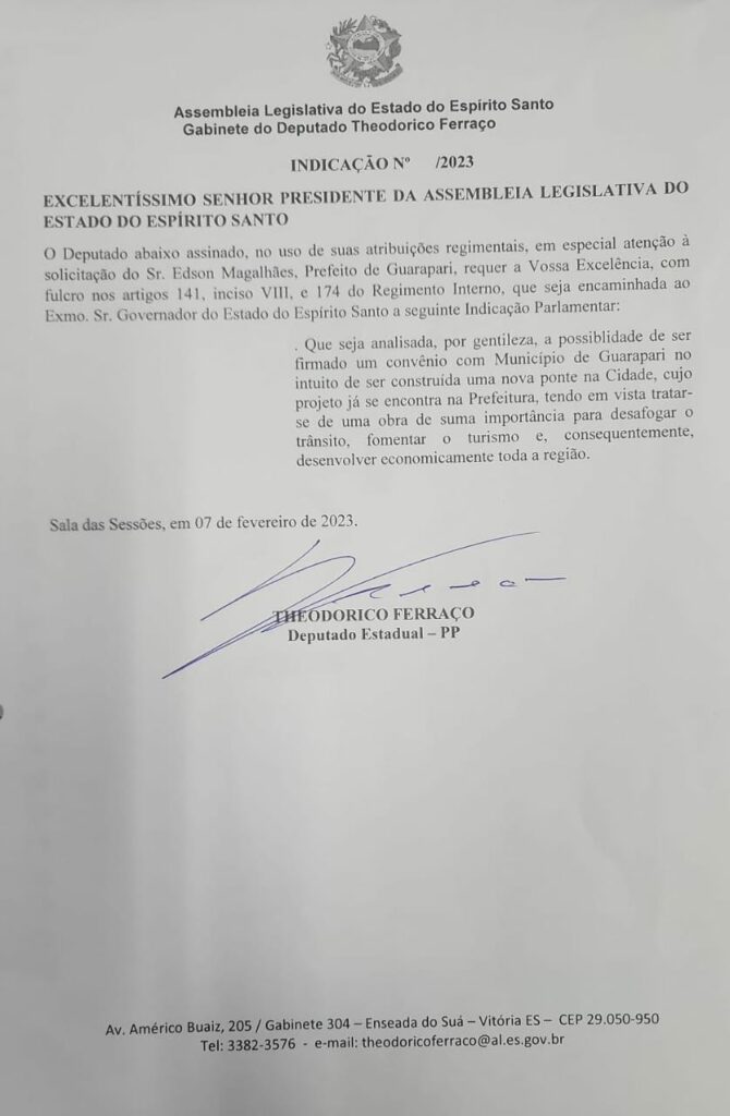 Na última terça-feira (07), foi aprovado por unanimidade, na Assembleia Legislativa do Espírito Santo, o requerimento do deputado estadual, Theodorico Ferraço, solicitando ao governo do estado, a execução da obra de construção da terceira ponte de Guarapari.