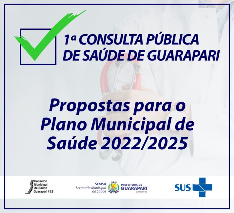 A Prefeitura de Guarapari, através da Secretaria Municipal de Saúde (Semsa) e em parceria com o Conselho Municipal de Saúde (CMS), programou uma Consulta Pública para direcionar o planejamento das políticas públicas da área e subsidiar a elaboração do Plano Municipal de Saúde para o triênio 2022-2025. A ação está marcada para acontecer entre os dias 20 e 25 deste mês.