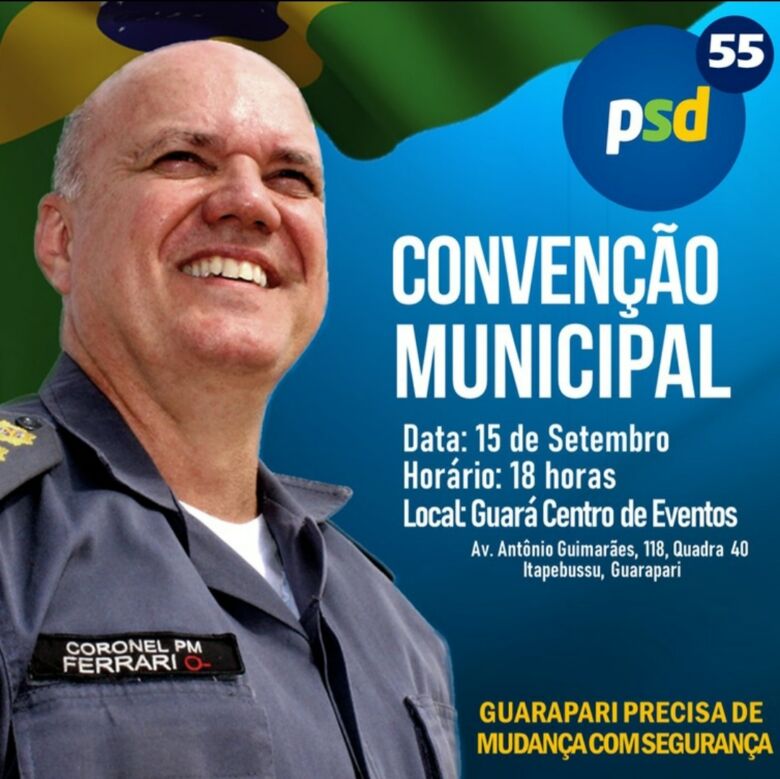 O Partido Social Democrático (PSD) de Guarapari realizou uma convenção municipal na última terça-feira (15), às 18h, no Guará Centro de Eventos, no bairro Itapebussu. No encontro, a candidatura do Coronel Ferrari foi confirmada na disputa pela prefeitura de Guarapari.