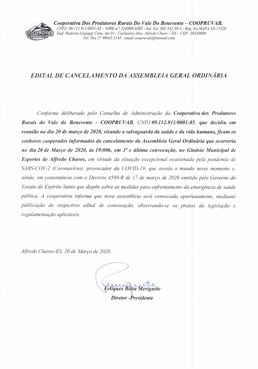 Coopruvab – Edital de cancelamento da Assembleia Geral Ordinaria