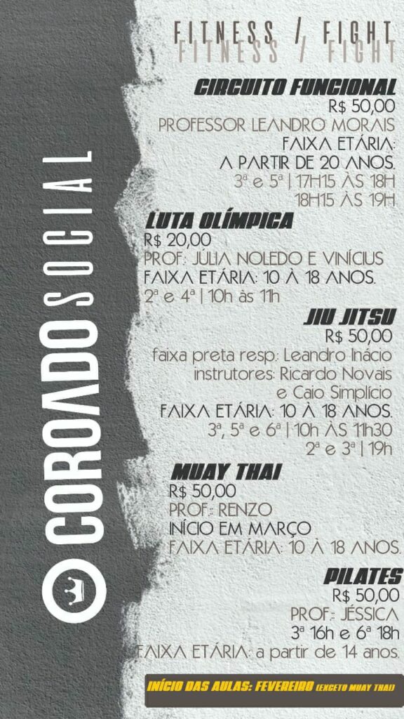 A Igreja Batista Coroado, em Guarapari, está com inscrições abertas para aulas de luta; Luta Olímpica, Jiu Jitsu e Muay Thai; Pilates e Circuito Funcional. As aulas fazem parte do Projeto Social que a igreja coordena desde 2013, onde realiza ações que visam ofertar melhorias para a comunidade do Coroado e do entorno.