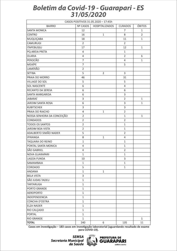 Até sábado, eram nove mortes na cidade, ontem, o boletim já registrava 11 óbitos. Ainda segundo a Semsa, dos 240 pacientes infectados em Guarapari, 135 estão curados e 6 encontram-se hospitalizados. Outros 183 casos suspeitos permanecem em investigação laboratorial, com resultado de exame pendente.