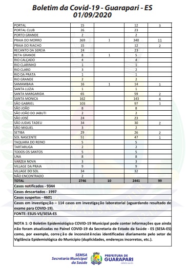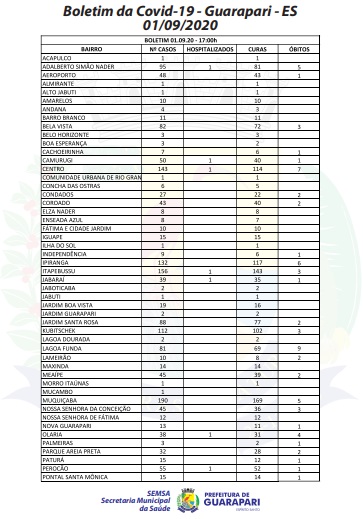 O boletim epidemiológico mais recente, divulgado hoje (01), pela Prefeitura de Guarapari, por meio da Secretaria Municipal da Saúde, atualiza o número de casos confirmados do novo coronavírus no município para 2.746 33 casos a mais que ontem (31). O informe também anuncia mais um óbito pela Covid-19 em Guarapari.