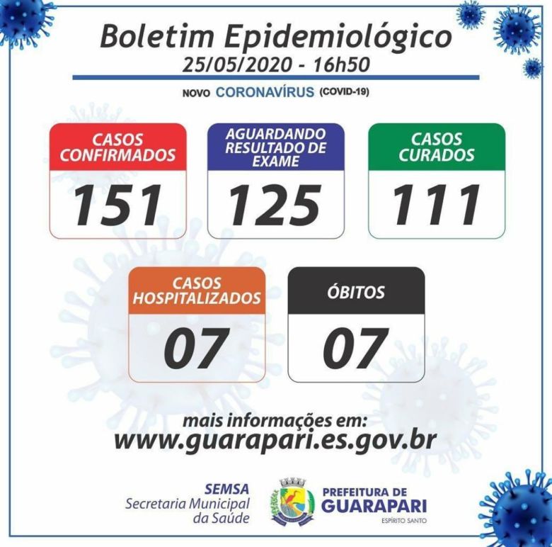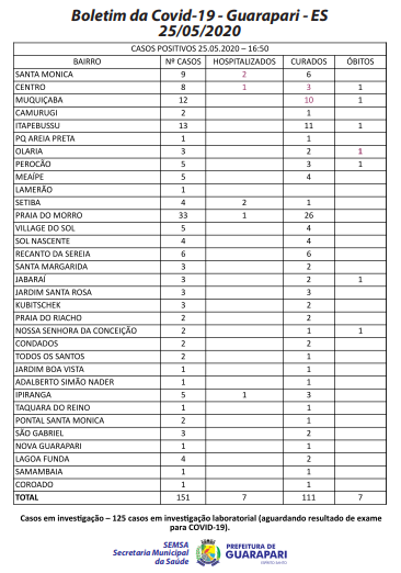 Ainda segundo a Semsa, dos 151 pacientes infectados em Guarapari, 111 estão curados e 07 encontram-se hospitalizados. Outros 125 casos permanecem em investigação laboratorial, aguardando resultado de exame.