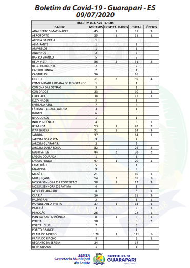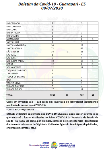Conforme o boletim epidemiológico mais recente, divulgado hoje (09) pela Prefeitura de Guarapari, por meio da Secretaria Municipal da Saúde, o município registra 1.233 casos do novo coronavírus (Covid-19), 55 casos a mais que ontem (08). Além disso, a cidade registrou mais uma morte pela doença.