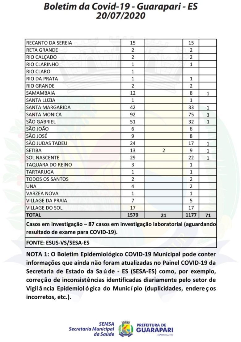O boletim epidemiológico divulgado hoje (15) pela Prefeitura de Guarapari, por meio da Secretaria Municipal da Saúde, informa que o município registra 1.579 casos do novo coronavírus (Covid-19), 101 casos a mais que ontem (19). Além disso, a cidade registrou mais dois óbitos.