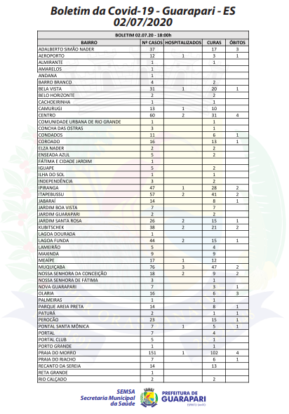 Confira o boletim detalhado atualizado, com a relação de casos da doença por bairros do município: