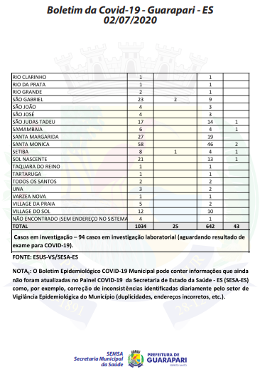 Conforme o boletim epidemiológico mais recente, divulgado hoje (02) pela Prefeitura de Guarapari, por meio da Secretaria Municipal da Saúde, o município registra 1034 casos do novo coronavírus (Covid-19), 21 casos a mais que ontem (01). Além disso, a cidade registrou mais duas mortes pela doença.