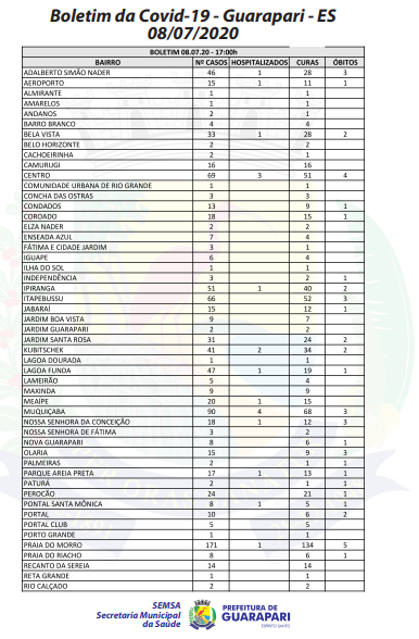 Confira o boletim detalhado atualizado, com a relação de casos da doença por bairros do município: