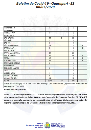 Conforme o boletim epidemiológico mais recente, divulgado na noite de ontem (08) pela Prefeitura de Guarapari, por meio da Secretaria Municipal da Saúde, o município registra 1178 casos do novo coronavírus (Covid-19). O número apresenta um aumento de 30 casos em relação ao dia anterior, terça-feira (07). Além disso, a cidade registrou mais duas mortes pela doença.