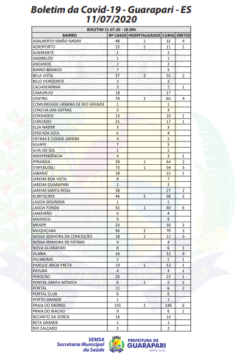 Confira o boletim detalhado atualizado, com a relação de casos da doença por bairros do município: