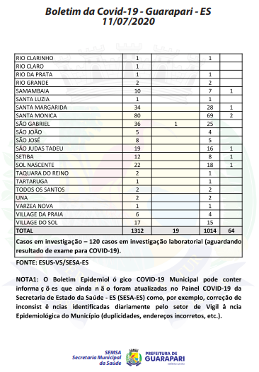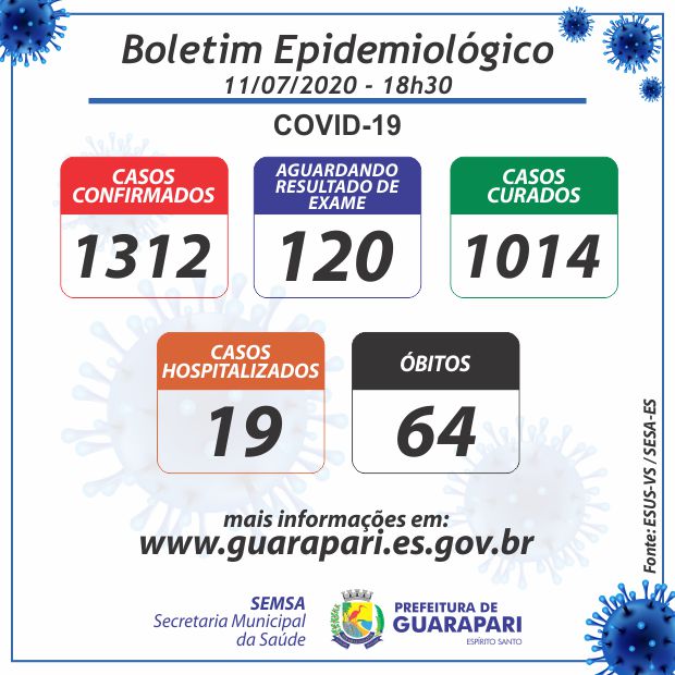 Conforme o boletim epidemiológico mais recente, divulgado hoje (11) pela Prefeitura de Guarapari, por meio da Secretaria Municipal da Saúde, o município registra 1.312 casos do novo coronavírus (Covid-19), 16 casos a mais que ontem (10). Além disso, a cidade registrou mais três mortes pela doença.