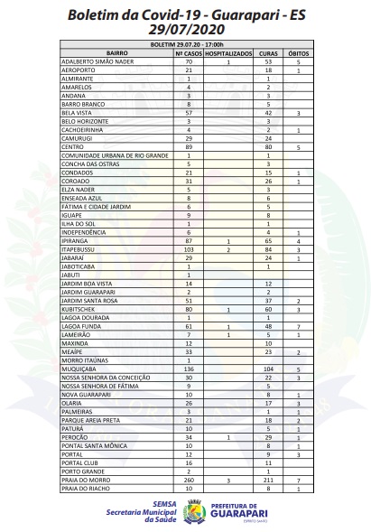 Nesta quarta-feira (29), foi registrada mais uma mortes por Covid-19 em Guarapari. A vítima fatal residia no bairro Bela Vista. Com isso, a cidade totaliza 80 óbitos.