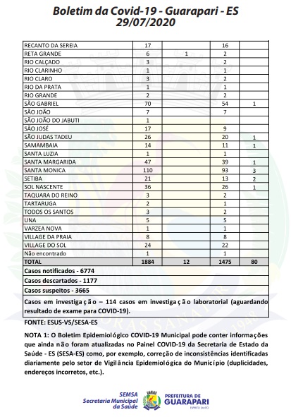 O novo boletim epidemiológico, divulgado hoje (29), pela Prefeitura de Guarapari, por meio da Secretaria Municipal da Saúde, atualiza o número de casos confirmados do novo coronavírus (Covid-19) no município para 1.884. São 40 casos a mais que ontem (28). O documento também indica mais um óbito na cidade, além de 3.665 casos suspeitos.