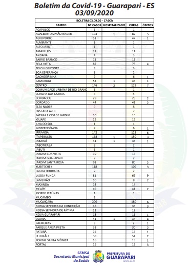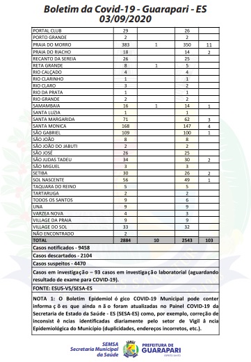 O boletim epidemiológico mais recente, divulgado hoje (03), pela Prefeitura de Guarapari, por meio da Secretaria Municipal da Saúde, atualiza o número de casos confirmados do novo coronavírus no município para 2.884, 91 casos a mais que ontem (02). O informe também anuncia mais três óbitos pela doença na cidade.