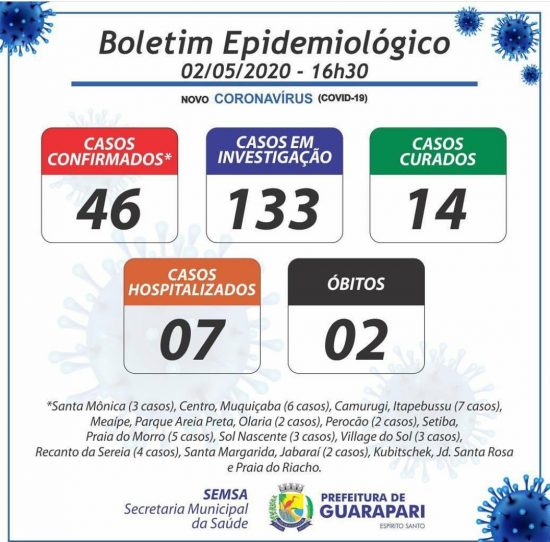 Hoje (02), a Prefeitura de Guarapari, através da Secretaria Municipal da Saúde (Semsa), divulgou um novo boletim epidemiológico. Conforme as atualizações, o município conta com 46 casos confirmados do novo coronavírus (Covid-19), 03 a mais que ontem (01).